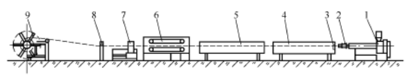În prezent, țevile din PVC și PO sunt produsele de cel mai mare volum atât pe plan intern, cât și internațional.Figura 1prezintă diagrama fluxului procesului de producție pentru țevile din poliolefină (PO). Plasticul este introdus în matrița de gol inelară (2) de către șurub ca o topitură plastifiată uniform, extrudand o țeavă paraison. Acesta intră imediat în unitatea de calibrare (3) pentru răcire și dimensionare, apoi suferă o răcire suplimentară suficientă în rezervorul de răcire (4). Țeava este scoasă cu viteză constantă de către reglabilunitate de transport(6)și în cele din urmă tăiați la lungimile specificate cu tăietorul (7). Țevile cu pereți subțiri cu diametre mai mici de 160 mm pot fi înfășurate în rulouri de bobinatorul (9).