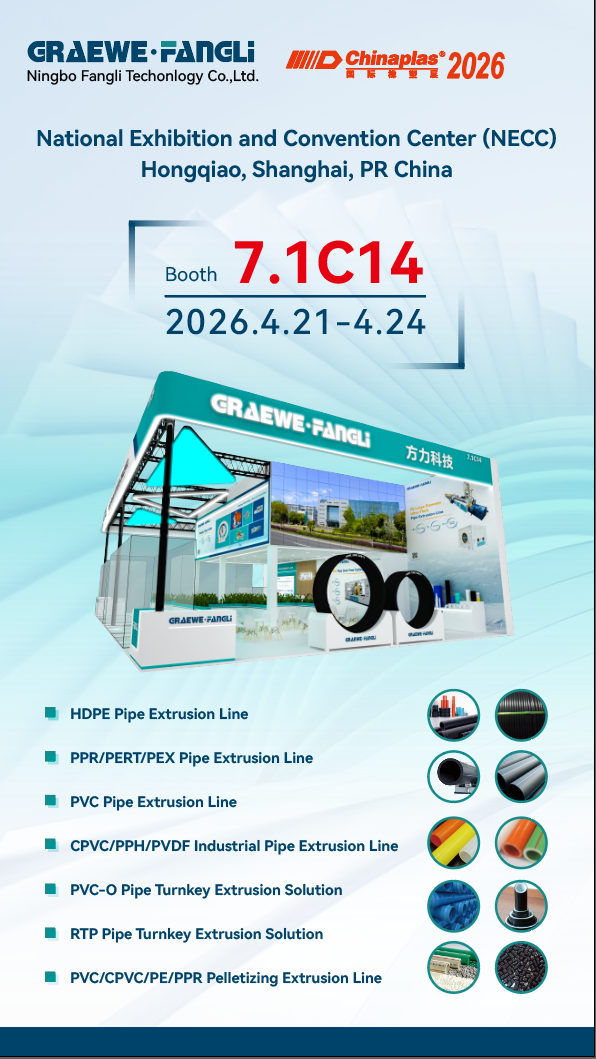 मराठी Bun venit la standul nostru 7.1C14 la ChinaPlas 2026,Ningbo Fangli Technology Co., Ltd.(denumită în continuare „Fangli”) este specializată în cercetare și dezvoltare, producție și vânzări deechipamente de extrudare a plasticului, noi linii de producție pentru protecția mediului, mașini de sudat țevi din plastic și mașini auxiliare din plastic.